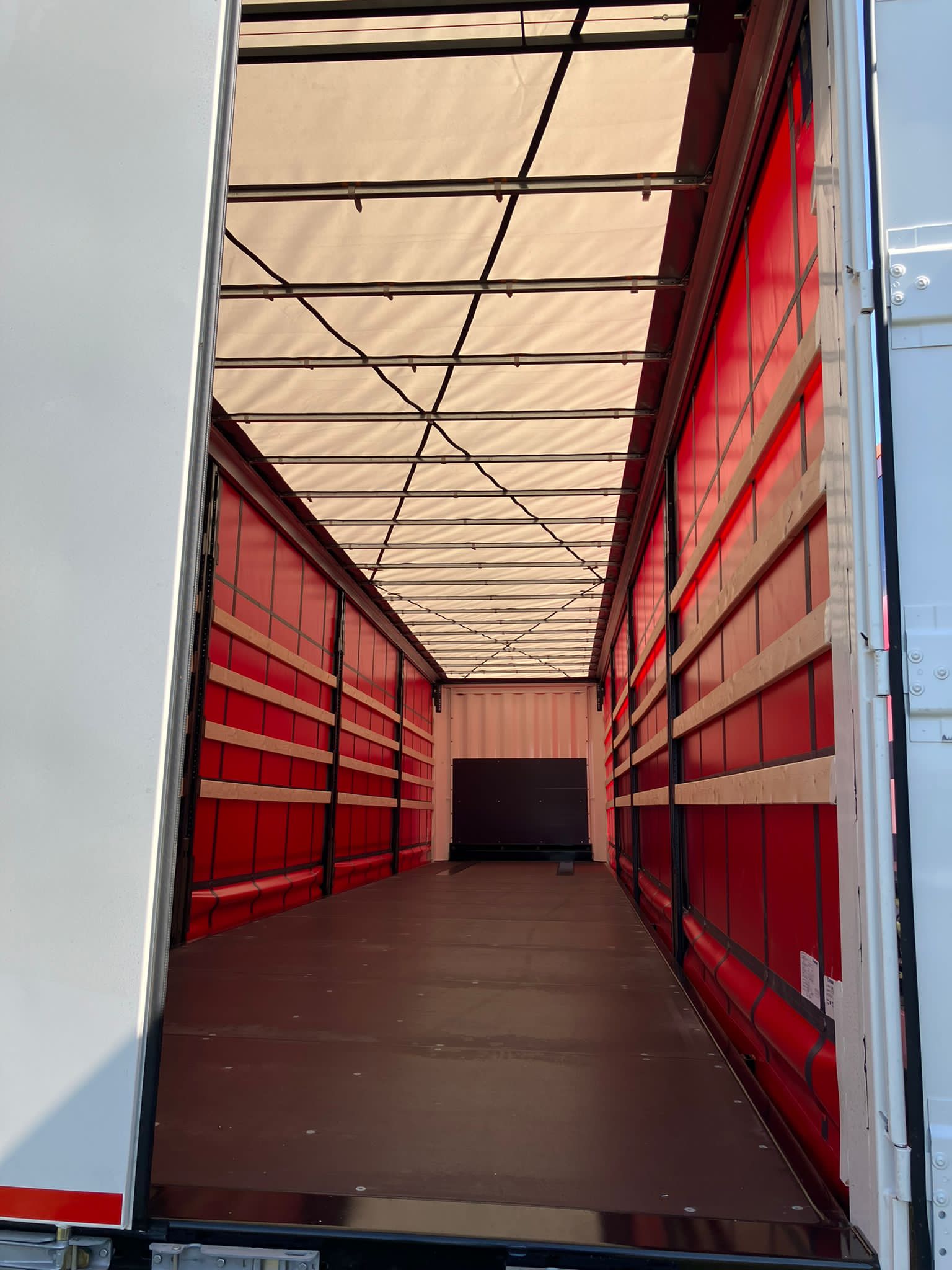 2025 registered but unused, Durabrites, 4.159m tall, sliding roof, Krone drum, white headboard and doors with red curtains, pillars and mmix of alloy and wood boards.